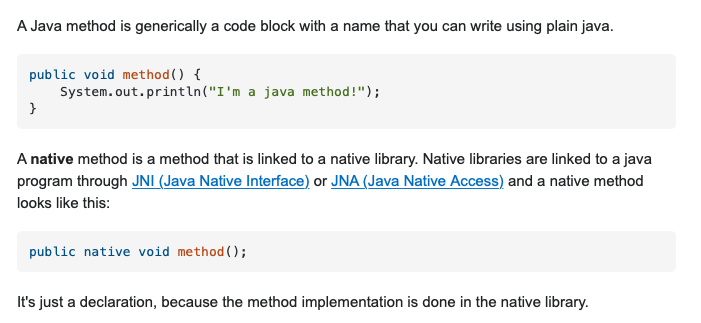 네이티브 메소드에 대해서 조금 더 설명을 해보자면, 이 메소드는 네이티브 라이브러리(Native Library)와 연결됩니다. 이때의 네이티브 라이브러리는 자바로 쓰여진 것이 아니라 C와 같은 다른 언어로 작성된 것들입니다. 이러한 라이브러리는 레거시(legacy) 데이터 혹은 성능을 위해서 사용되었는데요. 자바의 라이브러리도 발전을 하면서 점차 쓰이지 않게 되었습니다.