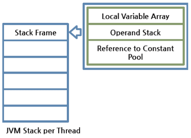 모든 JVM 스레드를 위해, 개별의 runtime stack은 스레드가 시작할 때 메소드 호출을 저장하기 위해서 생성됩니다. 모든 메소드 호출이 발생하면 하나의 시작점(entry)은 생성되어 runtime stack의 가장 위로 들어가게 됩니다. 이를 스택 프레임(stack frame)이라고 합니다. 각각의 프레임에는 로컬 변수의 배열, 오퍼랜드 스택, 상수 풀이 존재합니다.