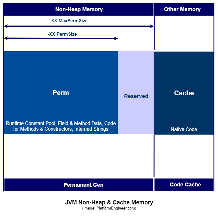 Non - Heap 영역은 Permanent Generation를 포함하고 있습니다. JRE에 포함되어 있지만, Heap 영역과 별도로 메모리에 존재합니다. 자바 8부터 Perm Gen이라고 하는 것이 Metaspace로 대체가 되었습니다. 기본적으로 클래스의 생성자들, 필드, 메서드를 저장합니다. 사이즈 또한 동적으로 변할 수 있습니다.