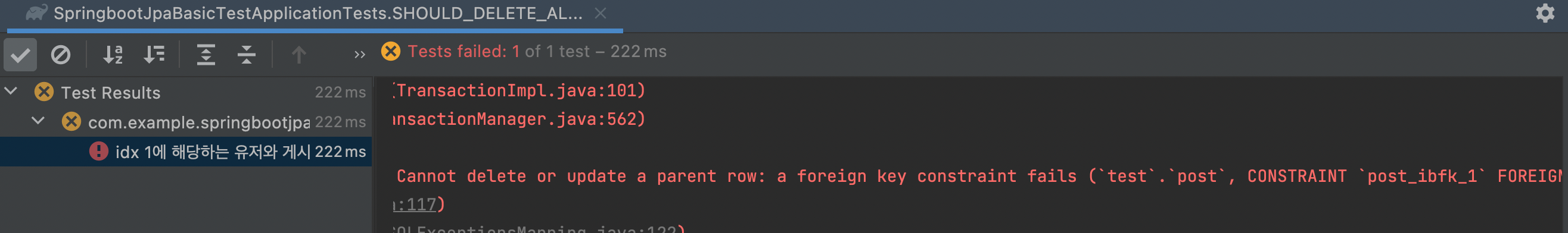 - 실패의 이유는 User를 삭제하려고 했지만, 이를 참조하는 Post가 여전히 남아있기 때문입니다.