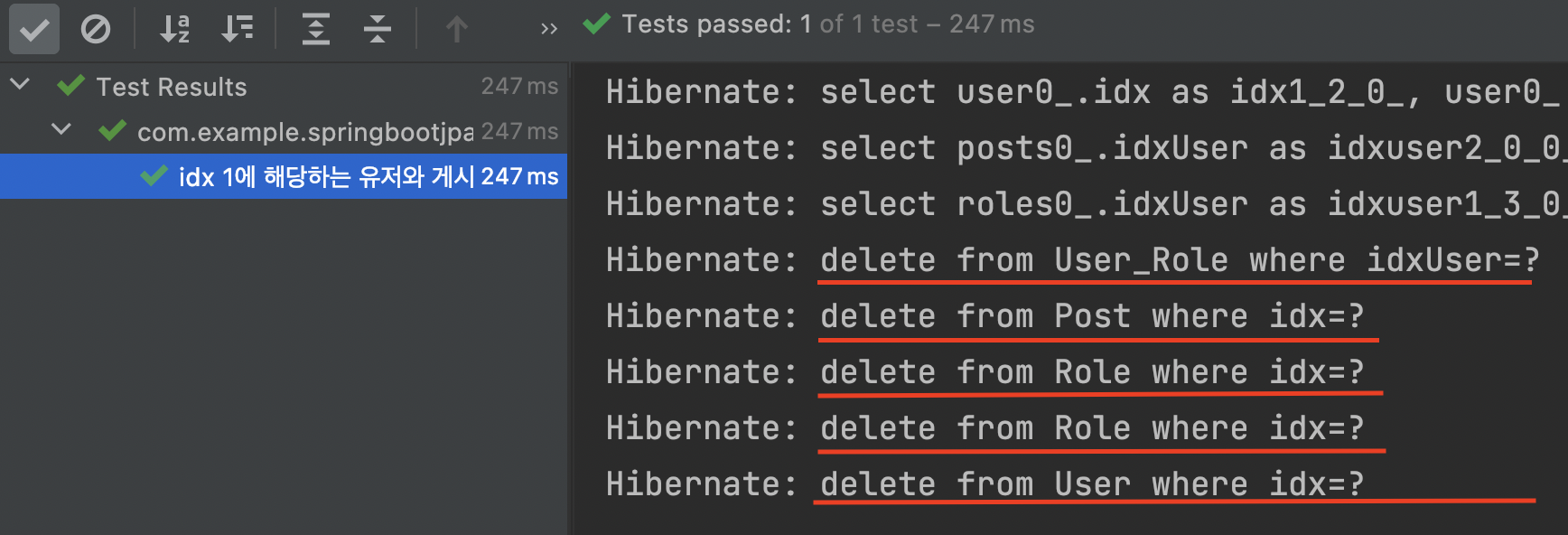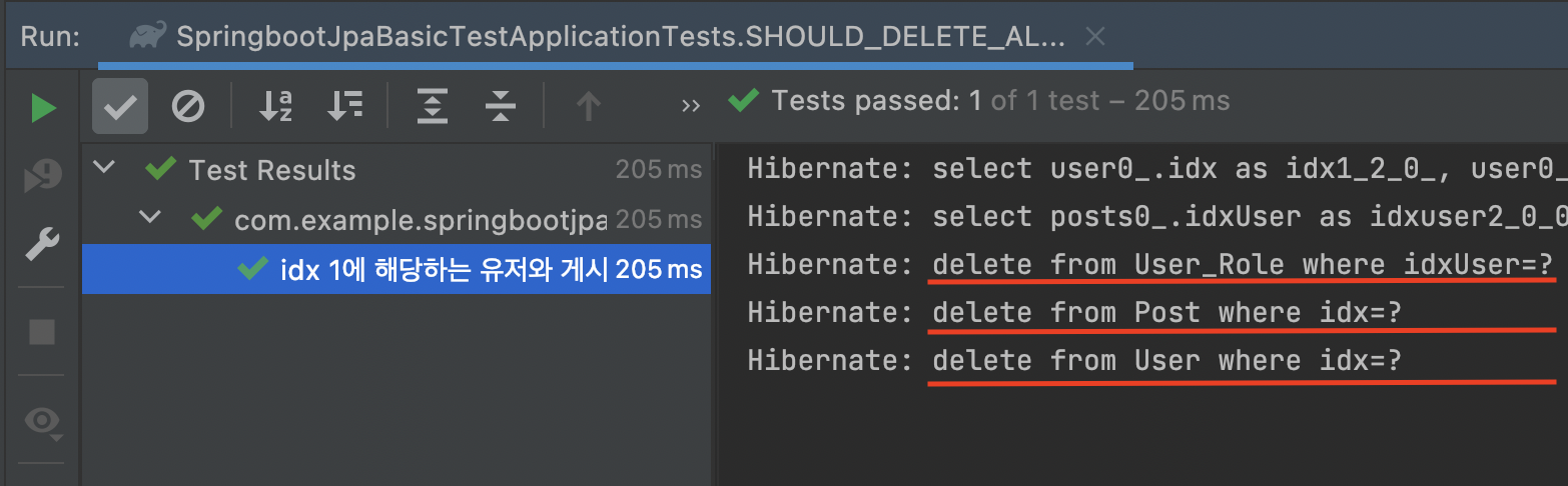 public class User { ... 생략 ... // CascadeType.ALL 추가 @OneToMany(mappedBy = "user", fetch = FetchType.LAZY, cascade = CascadeType.ALL) private Set<Post> posts; ... 생략 ... }- Post를 한 번에 지우기 위해 CascadeType.ALL 추가했습니다.