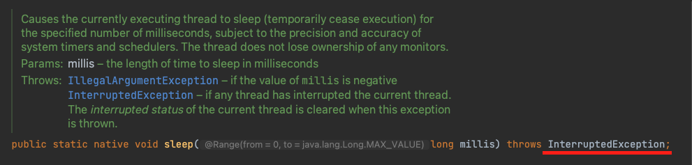 InterruptedException은 스레드가 waiting, sleeping, interrupted 된 상태에서 발생할 수 있습니다. 자바의 sleep() 메서드를 보게 되면, InterruptedException을 상위 메서드로 던지는 것을 알 수 있는데요.