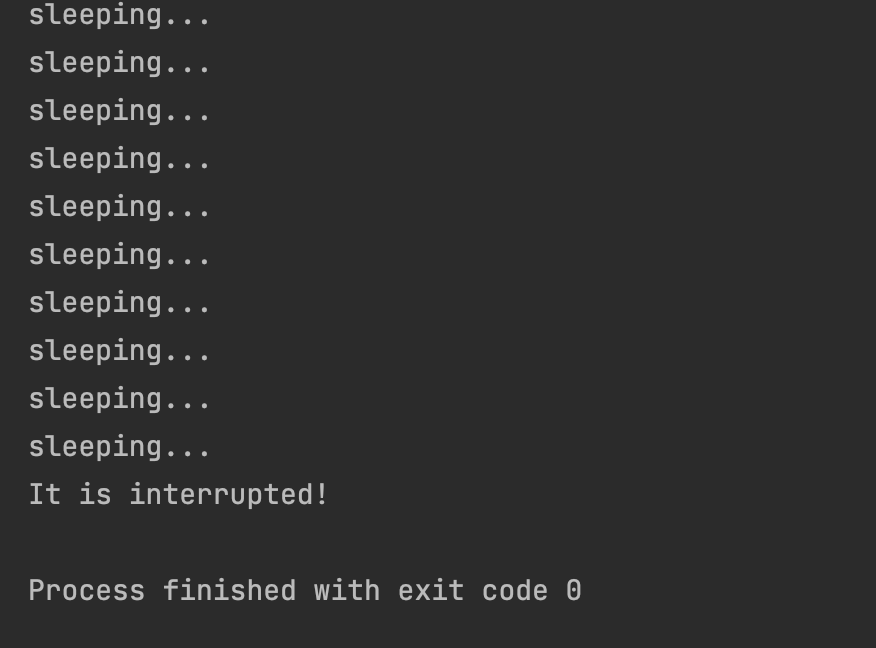 public class ExceptionTest { public static void main(String[] args) { Thread targetThread = new targetThread(); targetThread.start(); try { Thread.sleep(1000); // 1초 뒤 targetThread interrupt 합니다. targetThread.interrupt(); } catch (InterruptedException e) { System.out.println("finished!"); } } static class targetThread extends Thread { @Override public void run() { // Thread interrupt 될 때까지 반복합니다. while (!Thread.currentThread().isInterrupted()) { try { System.out.println("sleeping..."); Thread.sleep(100); } catch (InterruptedException e) { System.out.println("It is interrupted!"); // Thread.currentThread().interrupt(); } } } } }- Thread가 interrupt 될 때까지 Thread.sleep(1000) 반복합니다.