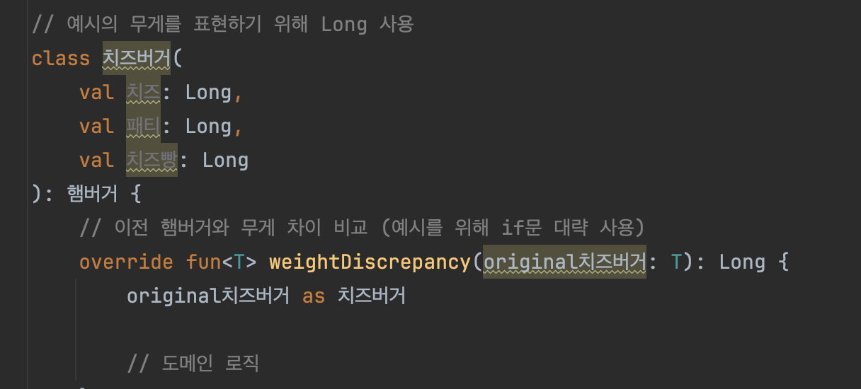 // 예시의 무게를 표현하기 위해 Long 사용 class 치즈버거( val 치즈: Long, val 패티: Long, val 치즈빵: Long ) { // 이전 햄버거와 무게 차이 비교 (예시를 위해 if문 대략 사용) fun weightDiscrepancy(original치즈버거: 치즈버거): Long { val 치즈무게차이 = original치즈버거.치즈.minus(this.치즈) val 패티무게차이 = original치즈버거.패티.minus(this.패티) val 치즈빵무게차이 = original치즈버거.치즈빵.minus(this.치즈빵) if (치즈무게차이 > 3) return 치즈무게차이 if (패티무게차이 > 3) return 패티무게차이 if (치즈빵무게차이 > 3) return 치즈빵무게차이 return 0 } } // 토마토버거 class 생략 fun weightDiscrepancy(original토마토버거: 토마토버거): Long { val 치즈무게차이 = original토마토버거.치즈.minus(치즈) val 토마토무게차이 = original토마토버거.토마토.minus(토마토) val 패티무게차이 = original토마토버거.패티.minus(패티) val 참깨빵무게차이 = original토마토버거.참깨빵.minus(참깨빵) if (치즈무게차이 > 3) return 치즈무게차이 if (토마토무게차이 > 3) return 토마토무게차이 if (패티무게차이 > 3) return 패티무게차이 if (참깨빵무게차이 > 3) return 참깨빵무게차이 return 0 } // 치킨버거 class 생략 fun weightDiscrepancy(original치킨버거: 치킨버거): Long { val 치킨무게차이 = original치킨버거.치킨.minus(치킨) val 치킨소스무게차이 = original치킨버거.치킨소스.minus(치킨소스) val 양상추무게차이 = original치킨버거.양상추.minus(양상추) val 얇은빵무게차이 = original치킨버거.얇은빵.minus(얇은빵) if (치킨무게차이 > 3) return 치킨무게차이 if (치킨소스무게차이 > 3) return 치킨소스무게차이 if (양상추무게차이 > 3) return 양상추무게차이 if (얇은빵무게차이 > 3) return 얇은빵무게차이 return 0 }- 이전에 만든 햄버거, 현재 만들고 있는 햄버거 재료들의 무게를 비교